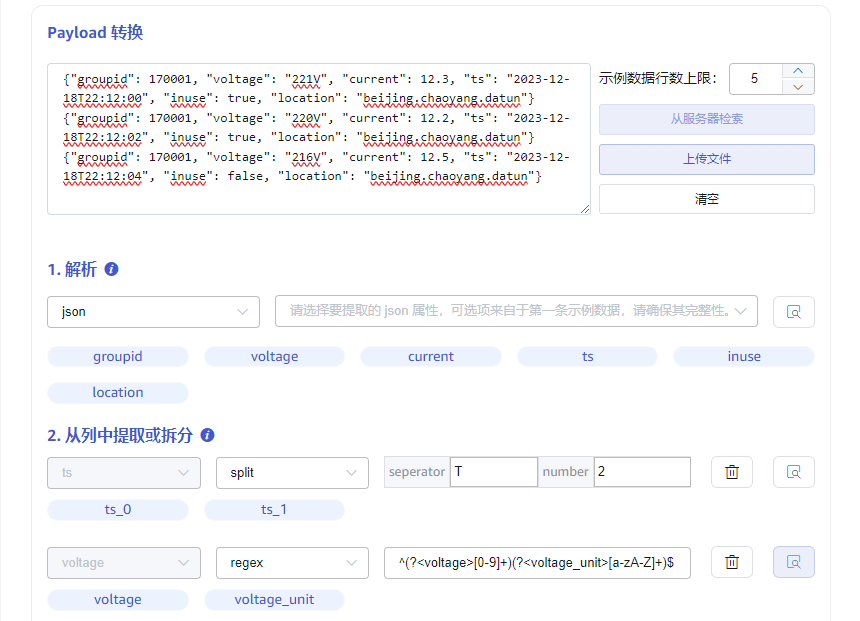 如下图所示可以对源字段ts使用 split 规则拆分成日期和时间,对字段voltage使用 regex 提取出电压值和电压单位。split 规则需要设置分隔符和拆分数量,拆分后的字段命名规则为{原字段名}_{顺序号},Regex 规则同解析过程中的一样,使用命名捕获组命名提取字段。