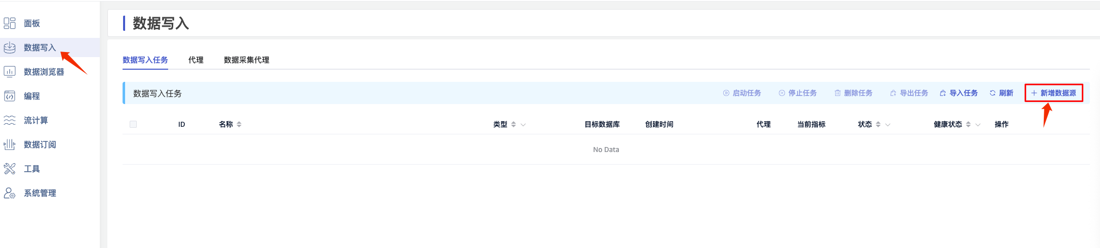 在数据写入页面中,点击 +新增数据源 按钮,进入新增数据源页面。