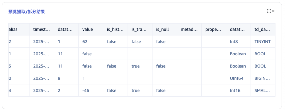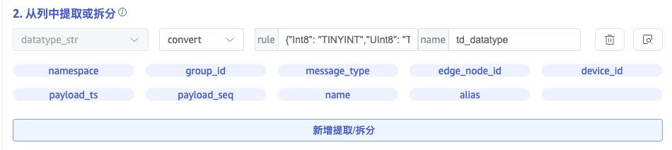 在 从列中提取或拆分 中填写从消息体中提取或拆分的字段,例如:将 datatype_str 字段的值转换为 TDengine TSDB 类型,在 rule 输入框中填写如下 json 值,在 name 中填写 td_datatype