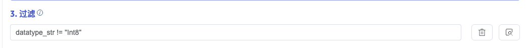 在 过滤 中,填写过滤条件,例如:填写datatype_str != "Int8",则只有 datatype_str 不为 Int8 的数据才会被写入 TDengine TSDB。