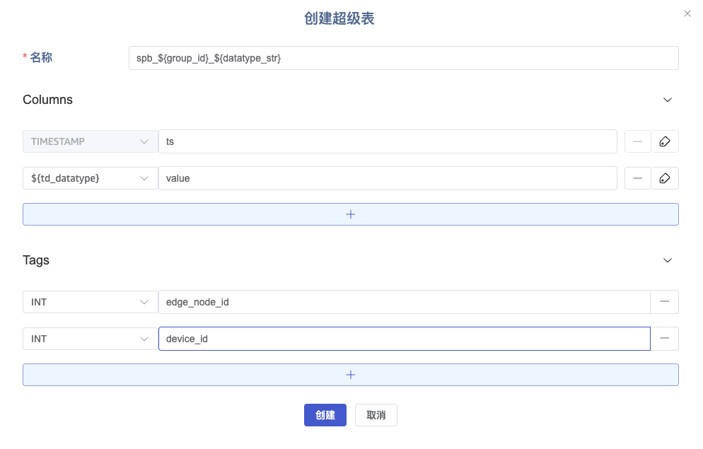 当超级表需要根据消息动态生成时,可以选择 创建模板。其中,超级表名称,列名,列类型等均可以使用模板变量,当接收到数据后,程序会自动计算模板变量并生成对应的超级表模板,当数据库中超级表不存在时,会使用此模板创建超级表;对于已创建的超级表,如果缺少通过模板变量计算得到的列,也会自动创建对应列。