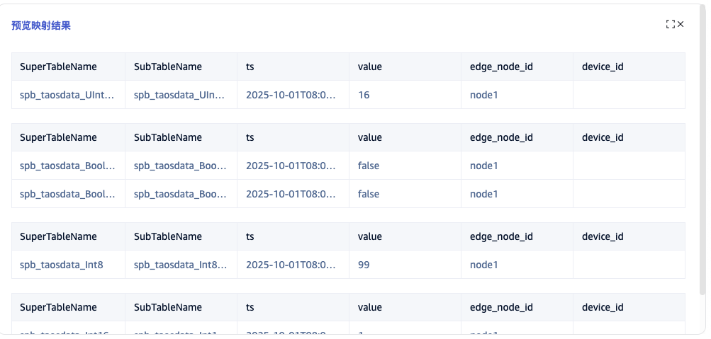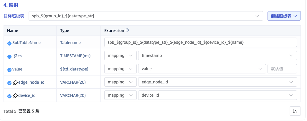 在 映射 中,填写目标超级表中的子表名称,例如:t_{id}。根据需求填写映射规则,其中 mapping 支持设置缺省值。