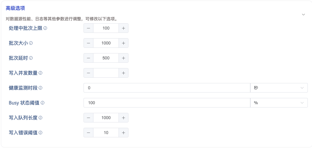 在 处理批次上限 中填写可以同时进行数据处理流程的批次数量,当到达此上限后,不再从消息缓存队列中获取消息,会导致缓存队列的消息积压,最小值为 1。