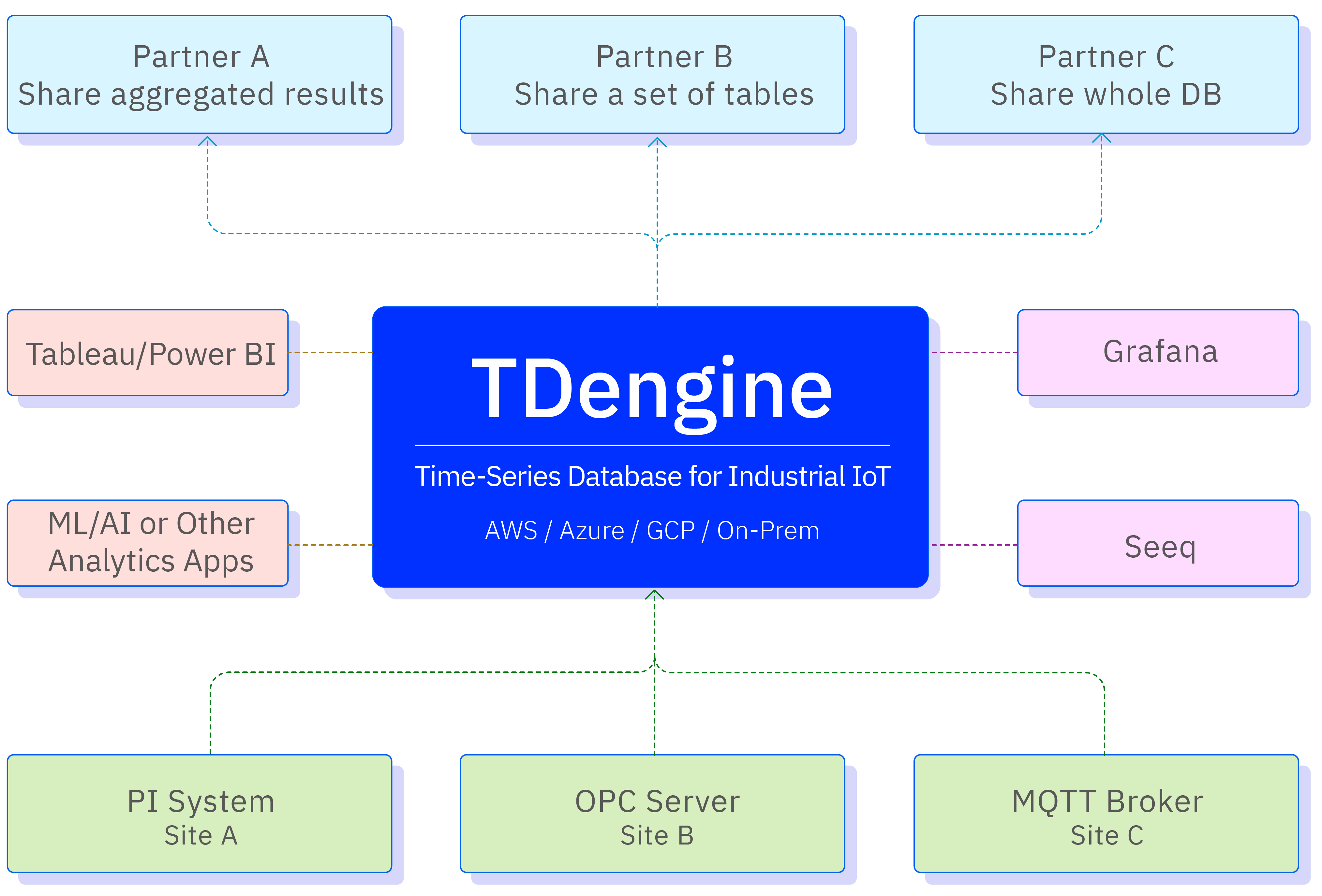 - 数据分发:TDengine TSDB 提供数据订阅功能,允许将一个数据库、一张超级表、一组表或单张表的数据、以及在特定时间段聚合、过滤加工处理后的数据实时分发给第三方应用。这一功能不仅实现了数据分发的颗粒度精细可控,而且通过权限控制及加密等措施确保了数据分发的安全。